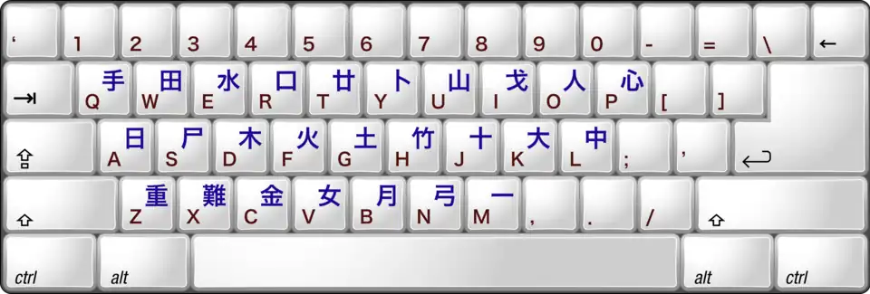 | Speciale toetsen | X | 難 moeilijk | Deze toets wordt gebruikt voor speciale moeilijke karakters (難字), zoals 臼 wat ingevoerd kan worden met 竹難 | |