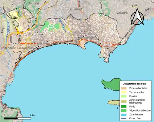 De onderstaande kaart toont de ligging van Cannes met de belangrijkste infrastructuur en aangrenzende gemeenten.