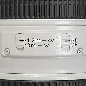 Schakelaar focusbeperking: Deze schakelaar is vooral te vinden op lenzen met een grote brandpuntsafstand en macro-objectieven. De schakelaar beperkt de afstand waarop de lens in autofocus-stand zal proberen scherp te stellen. Wanneer deze schakelaar effectief wordt gebruikt kan de scherpsteltijd worden ingekort omdat de lens niet zal gaan 'zoeken' in een ongewenst focus-gebied.