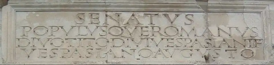 Een inscriptie in capitalis monumentalis op de triomfboog van Titus, Rome