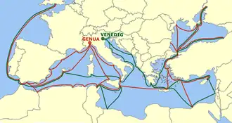 De Italiaanse maritieme republieken hadden in de hoge en late middeleeuwen een groot aandeel in het handelsverkeer rond de Middellandse Zee. Ieder voor zich probeerden ze tot handelsovereenkomsten te komen met machthebbers in het oostelijk deel van het gebied. Zo wist Pisa extraterritoriale privileges te verkrijgen voor zijn onderdanen in Jeruzalem, Beiroet, Jaffa, Cyprus en Rhodos. Daarnaast verkreeg het in 1173 speciale concessies van Saladin, de sultan van Egypte, op voorwaarde dat er geen kruisvaarders vervoerd zouden worden.[14]