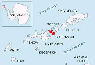 | Arturo Prat Base met Rousseau Peak en Fuerza Aérea Gletsjer op de achtergrond. | |