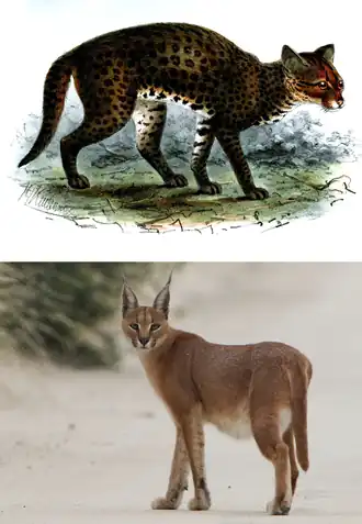 | Afrikaanse goudkat (Caracal auratus; boven), Caracal (Caracal caracal; onder) | |||||||||||||