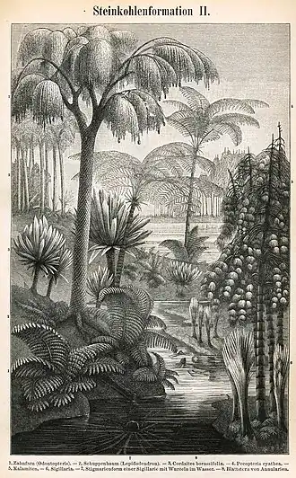 In het Laat-Carboon verschenen de eerste Amniota (reptielen), dieren die hun eieren op het land konden leggen en daarom niet meer altijd in de buurt van open water hoefden te leven, zoals amfibieën.[11] De oudst bekende sauropsiden (voorouders van de dinosauriërs en vogels, zoals Hylonomus of Petrolacosaurus) en synapsiden (voorouders van de zoogdieren, zoals Archaeothyris) leefden in het Midden-Carboon. Reptielen werden echter pas in het Perm dominant.