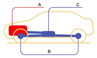 Bij vierwielaandrijvers wordt bij voorkeur gebruikgemaakt van assen van gelijke lengte (legenda: A = motor; B = aangedreven assen; C = tussenbak)