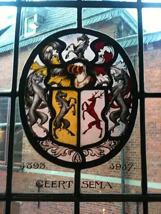 Beno Hofman verkleed als Carel Coenraad Geertsema bij zijn wapen in het provinciehuis van Groningen tijdens Monumentendag 2016. Geertsema was een drijvende kracht achter de plaatsing van deze wapens van Commissarissen van de Koningin van Groningen in het provinciehuis.