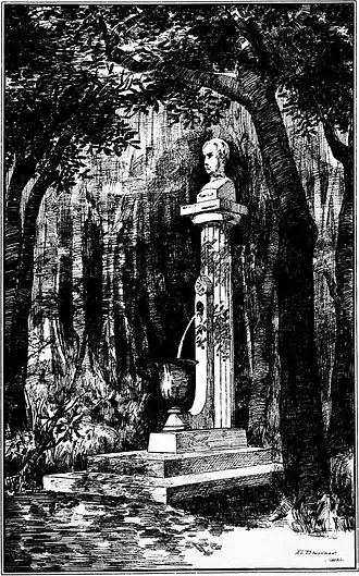 Door de bekende kunstenaar Lourens Alma Tadema, een goede vriend van Vosmaer, werd te zijner nagedachtenis een waterbron ontworpen. Een zuil van twee meter hoog met daarop een buste van Vosmaer, gemodelleerd door Johan Philip Koelman. Op de zijden van de abacus, tussen het kapiteel en het borstbeeld, stonden in goud de namen Rembrandt, Homeros, Nanno en Amazone. Vóór de zuil een bronzen bekken, dat voortdurend zou worden gevuld door een waterstraal vanuit de zuil. Het kunstwerk zou verrijzen in de Scheveningse Bosjes. Nadat de Haagse Gemeenteraad in eerste instantie negatief oordeelde over het plan, werd in 1890 toch toestemming verleend. (de gemeenteraad had liever een herdenkingsbank gezien) Naar aanleiding hiervan werd later dat jaar bij de onthulling de schrijver Conrad Busken Huet aangehaald: Onze beste kans is, dat men, evenals voor Cremer, een bank voor ons opricht in de Scheveningse boschjes. Dan kunnen de Nederlanders op ons gaan zitten, en ons warm houden. Oók over die bank moest gij eens een artikeltje schrijven, en over het verkiezen van die bank boven eene fontein. Dit zijn van die nationale karaktertrekken, die mij steeds amuseeren. De Vosmaerbron is tijdens de Tweede Wereldoorlog gesneuveld. Het park waarin het lag, werd door de bezetter tot Sperrgebiet verklaard, waarna er geen onderhoud plaatsvond. Normaal gesproken werd het monument tijdens de winter in hout verpakt tegen de vorst. Toen dat achterwege werd gelaten barstte het monument.[2] De straatjeugd bevuilde en beschadigde de buste, waarop de rector van het Maerlant-Lyceum in maart 1946 een verzoek indiende bij de Burgemeester om het monument over te brengen naar het schoolplein op de Bildersstraat.[3]