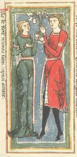 - f72v: Dwarsliggende miniatuur; jongen geeft bloemen aan een meisje.