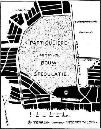 De eerste taak van de Stichting was het vinden van een locatie voor Carnegies 'Vredestempel'. De Nederlandse regering beschikte niet over een terrein dat hier geschikt voor was en dus moest er grond worden aangekocht. In augustus 1904 diende de Stichting een verzoekschrift in bij de regering om de kwestie snel op te lossen. Voorzitter Van Karnebeek had zijn oog laten vallen op de Koekamp bij het Haagse Bos, maar toen het publiek hier kennis van nam was de verontwaardiging groot. Een aantasting van de Koekamp was ondenkbaar en in strijd met de Akte van Redemptie uit 1576. De gemeenteraad moest er zelfs aan te pas komen om dit plan te dwarsbomen.[2] Ter compensatie bood de gemeente Den Haag de Sint Hubertusheuvel, het Belvédère en het huidige Westbroekpark aan. Ondertussen deden ook de exploitatiemaatschappij Park Zorgvliet en de grootgrondbezitter de Gravin van Bylandt aanbiedingen, waarbij de laatste de voorkeur van de Stichting had. Op 15 oktober schreef Van Karnebeek de regering, die bereid was het terrein van Van Bylandt te kopen en vervolgens aan de Stichting te schenken. Nu ging echter de Tweede Kamer niet akkoord, waarna de regering de gemeenteraad opdroeg de kwestie op te lossen. Deze stelde vervolgens een gedeelte van het Haagse Bos ter beschikking en ook nu kwam er een stroom van protest op gang, waarna de raad op 23 januari 1905 een definitief einde maakte aan dit plan door er zijn veto tegen uit te spreken. Vervolgens stelde Van Karnebeek een ander gedeelte van het Haagse Bos voor, wat de sympathie bij het publiek voor het Vredespaleis niet bepaald ten goede kwam.