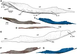 Het holotype NCSM 21558 omvat de meeste delen van het skelet: een gedeeltelijke schedel (premaxilla, maxilla, traan- en jukbeen), delen van de onderkaak (angulare en articulare), een intercentrum van de atlas, wervelbogen van een halswervel en een ruggenwervel, ribben en een opperarmbeen. Het enkel genoemd exemplaar NCSM 21623 wordt weergegeven door een deel van een linkeropperarmbeen, kleiner dan dat van het holotype. Het holotype en het toegewezen exemplaar werden in meer detail beschreven door Drymala en Zanno in een PLOS One-artikel uit 2016.