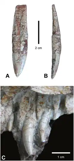 De lage premaxilla bezat ten minste zes tanden en een inkeping aan de achterkant van de rij tanden, vergelijkbaar met Dromicosuchus. Net als andere archosauriërs heeft de premaxilla een palataal uitsteeksel, een intern georiënteerd uitsteeksel dat de voorkant van het verhemelte vormt (dak van de mond). Er is een opvallende opening in dit uitsteeksel die zich kan hebben gemanifesteerd als een klein gaatje in het verhemelte. Dit gat wordt ook waargenomen bij bepaalde andere vroege crocodylomorfen, en het kan een vergrote vierde tand van de onderkaak herbergen. De premaxillaire tanden zijn slank, gekarteld en naar achteren gebogen.