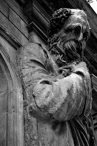 Het gelijkvloers telt zes kolossale gevelbeelden. Zes ervan stellen onderworpen "barbaren" voor: elk beeld is geïndividualiseerd en expressief. Ze zijn als het ware opgehangen aan de Toscaanse pilasters en hebben geen dragende functie, waardoor het feitelijk niet juist is te spreken van atlanten. Het zijn hermen, of eigenlijk termen, die aan de knieën zijn afgesneden. De god Terminus was een symbool van de stoïcijnen. Hun twee halflijvige collega's aan weerszijden van de poort buigen vooruit uit de muur. Naakt en met gekruiste armen torsen ze de balkonsteunen op hun rug. Hun bovenlichaam rust op een platform en een console met een mascaron van een leeuwenkop.