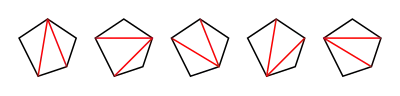 - is het aantal manieren waarop een convexe veelhoek met zijden in driehoeken langs de diagonalen kan worden verdeeld. De figuur toont het geval :