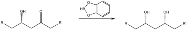 Catecholboraan kan gebruikt worden als een stereoselectief reducerend reagens bij de omzetting van β-hydroxyketonen naar syn-1,3-diolen.[4]