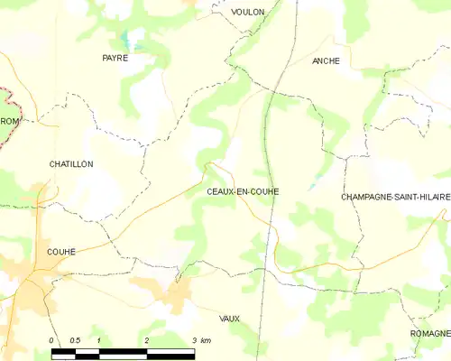 De onderstaande kaart toont de ligging van Ceaux-en-Couhé met de belangrijkste infrastructuur en aangrenzende gemeenten.