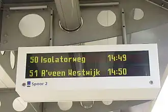 - Het vertrekspoor. Een afwijking van het vertrekspoor zal om en om getoond worden met de tussenstations.