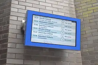 - De vertrektijd en de treinsoort (- Internationale trein, Hogesnelheidstrein, Intercity, Sneltrein, Stoptrein, Sprinter of speciale trein). Indien de trein vertraagd is gaat er een blauwe balk knipperen onder de treinsoort met de vertraging in een veelvoud van vijf minuten.