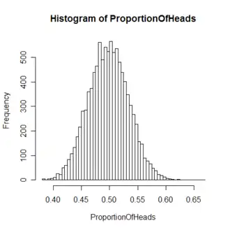 Histogram van de fractie "kruis" bij 200 worpen met een eerlijke munt in 10000 experimenten