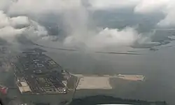 Het nog onbebouwde Centrumeiland, grenzend aan het Haveneiland aan de linkerzijde en verbonden met het vasteland via de Benno Premselabrug op de voorgrond (juli 2015)