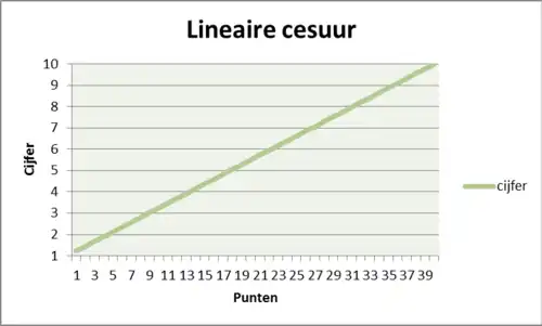 De waarden 9 en 1 zijn niet toevallig. De factor 9 en het minimumcijfer 1 moeten samen het maximumcijfer geven (dus 1 + 9 = 10). Het percentage waarbij precies een voldoende wordt gehaald noemen we het cesuurpercentage. In dit geval is dat 10/20 = 50%.