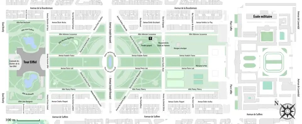 Nadat deze militaire school in 1751 was opgericht door Lodewijk XV, met de bedoeling 500 zonen van verpauperde officieren op te leiden, transformeerde de bouwmeester Jacques-Ange Gabriel de moerassige vlakte tussen de nieuwe gebouwen en de Seine in een oefenterrein, naar analogie van de Campus Martius te Rome. Vanaf 1780 werden de tuinen toegankelijk voor het publiek. In 1783 en 1784 stegen Jean Pierre Blanchard en Jacques Charles vanaf het exercitieveld op in een ballon.