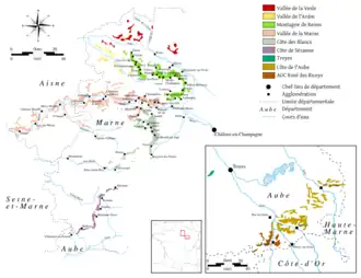 Champagne bestaat uit twee regio's. De noordelijke regio ligt rondom de driehoek Reims (N), Épernay (W) en Châlons-en-Champagne (ZO). De zuidelijke regio ligt ten zuiden van Châlons en wordt begrensd door Bar-sur-Aube (N0), Bar-sur-Seine (W) en Mussy-sur-Seine (Z).
