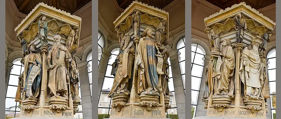 Van de oorspronkelijke calvarie in het midden van de kloostergalerij zijn de voornaamste delen – een gekruisigde Christus met Maria Magdalena aan de voet van het kruis – op een enkel stuk na verdwenen. Het centrale deel, de Mozesput, is bewaard gebleven. Het staat nu in een later gebouwd paviljoen en is in 1840 tot historisch monument verklaard. Het monument diende oorspronkelijk als sokkel voor een kruisbeeld. Het bestaat uit losstaande beelden van de zes oudtestamentische profeten, die omgeven zijn door treurende engelen. Elke profeet is duidelijk herkenbaar aan zijn attributen (hoorns bij Mozes, een lier bij David etc.) en heeft een band met een Bijbelse tekst in de hand. De gezichten zijn zeer realistisch, naar het schijnt geïnspireerd door ouderen uit de joodse gemeenschap van die tijd. Hier en daar zijn nog resten van de oorspronkelijke polychrome beschildering zichtbaar. Drie beelden zijn pas na de dood van Sluter (1406) gereedgekomen. Een zestiende-eeuwse kopie van het monument staat sinds 1968 in het centrum van Dijon.