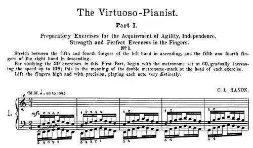 - ↑ Studie van de oefeningen van Hanon zou als resultaat hebben dat individuele bewegingen en spieren in de hand getraind worden, zodat de diverse combinaties van vingervolgordes secuurder kunnen worden uitgevoerd, en dat de vingers meer onafhankelijk van elkaar kunnen bewegen, iets dat fysisch gezien niet geheel mogelijk is, aangezien de spieren van de 3e, 4e en 5e vinger aan elkaar verbonden zijn door een tweetal pezen die over de middenhand lopen.