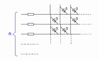 De besturing kan elke geleider op hoge spanning H, lage spanning L of in toestand van hoge impedantie Z (3-state) brengen. Bij maximale bezetting van de matrix staan tussen elk paar geleiders twee leds parallel, met tegengestelde polariteit (ook wel minder juist anti-parallel genoemd). Het aantal leds bedraagt . De besturing zet achtereenvolgens in n fasen op elke geleider een L. Tijdens elke fase komt op de andere geleiders een H of een Z. Elke led, die zich tussen een lijn met niveau L en één met niveau H bevindt, brandt, mits de polariteit juist is. De rollen van L en H mogen verwisseld zijn.