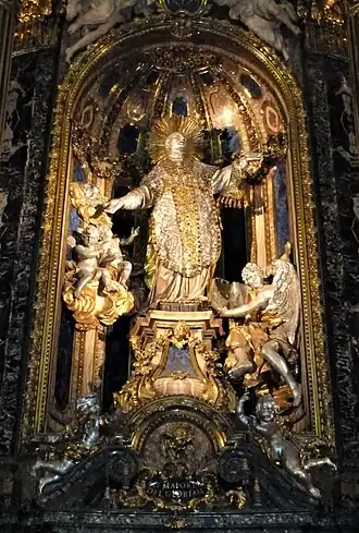 Achter het altaar bevindt zich een grote nis waarvan de wand is bekleed met verguld brons, lapis lazuli en andere soorten (edel)steen: albast, marmer, onyx, amethist en kristal. In deze nis staat het levensgrote zilveren beeld van Ignatius in gebedshouding opgesteld, met naast hem tweemaal drie engelen. De nis met deze beelden is uitsluitend op bepaalde feestdagen permanent zichtbaar; op andere dagen gaat ze het merendeel van de tijd schuil achter het altaarschilderij van de hand van Andrea Pozzo dat Ignatius toont die van de verrezen Christus het vaandel met het Christusmonogram krijgt aangereikt. Enkel in de vooravond laat een speciaal mechanisme dit altaarschilderij gedurende korte tijd neerzakken achter het altaar om zo de nis met de zilveren beelden te onthullen.
