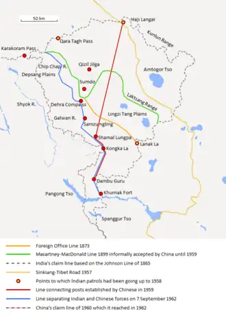 India en China hebben een lange grens in bergachtig gebied. De Britse landmeter Johnson had in 1865 de westgrens bepaald in opdracht van de Maharadja van Kasjmir. China was het daarmee toen oneens en zette zelf grenspalen op de oude karavaanroute tussen Sinkiang en Ladakh. In de 19e eeuw stond Groot-Brittannië gebied af aan China om een buffer tegen Rusland te hebben. Dit was de MacCartney-MacDonald-lijn. Na de Russische Revolutie in 1918 tekenden de Britten opnieuw de Johnson-lijn op hun kaarten. In 1950 legden de Chinezen de strategisch belangrijke nationale weg G219 aan door Aksai Chin tussen Sinkiang en Tibet. Aangezien het gebied van Indische kant niet toegankelijk is door het Karakoramgebergte, merkten de Indiërs dat pas in 1957 toen de weg op Chinese kaarten aangeduid werd.