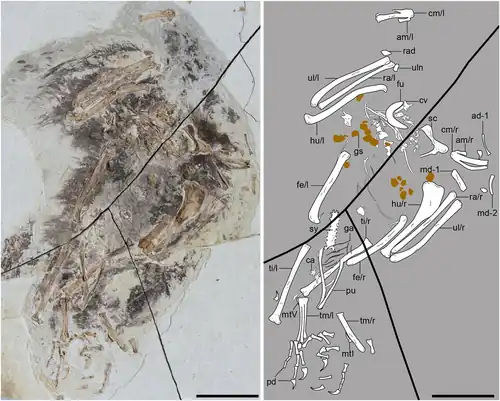 Het holotype STM 9-9 is gevonden in een laag van de Jiufotangformatie die dateert uit het Aptien. Het bestaat uit een skelet zonder schedel, platgedrukt op een enkele plaat. Het skelet ligt niet in verband maar de botten bevinden zich min of meer in positie. Behalve de schedel ontbreekt het grootste deel van de wervelkolom op het heiligbeen en de staartbasis na. Weke delen zijn bewaardgebleven waaronder uitgebreide resten van het verenkleed. Verder zijn maagstenen, gastrolieten, aanwezig. Het betreft een jongvolwassen of volwassen individu.