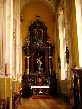 De zijbeuken eindigen met eiken altaren die werden vervaardigd door Joseph Rifesser. Het linker altaar bevat een kopie van de Sixtijnse Madonna geflankeerd door beelden van Albert van Riga en Sint-Monica en daarboven een schilderij van Sint-Casimir. Een beeld van Sint-Franciscus die een helpende hand biedt aan de gekruisigde Christus naar een schilderij Bartolomé Esteban Murillo en daarboven een schilderij van Sint-Stanislaus domineren het rechter zijaltaar.
