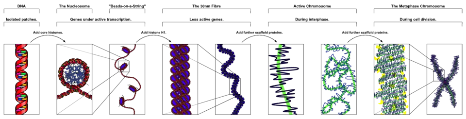 - Hogere orde compactheid die uiteindelijk leidt tot gecondenseerde chromosomen, de meest compacte vorm.