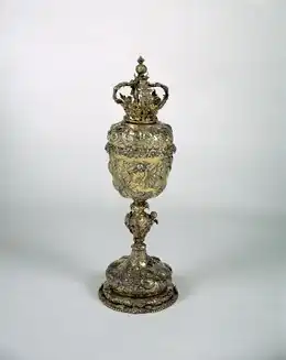 Ciborie op ronde voet, met drie cherubskopjes op eivormige nous. Omstreeks 1731 and 1754.