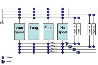 Tussen de objecten en de CIP-set worden routes (strengen) gebruikt. Deze bestaan uit een combinatie van pompen, kleppen en opnemers en zijn zo ontworpen, dat de door de objecten gevraagde reiniging correct kan worden uitgevoerd. Onderdelen hiervan zijn:
