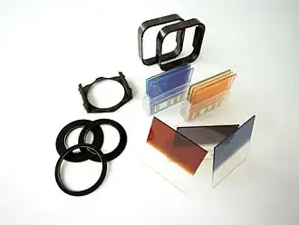 De beschikbare filters zijn zeer divers: er zijn kleurcorrectiefilters, grijsfilters, polarisatiefilters en allerlei voorzetlenzen die bepaalde vervormingen geven zoals vervaging, vergroting of lichtbreking. Het optische materiaal waaruit de filters zijn vervaardigd, is voor bijna alle filters een polymeer, die soms wordt aangeduid met de naam organisch glas. Voor sommige filters wordt een glassoort gebruikt.