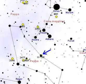 Collinder 135 (Pi Puppis groep, π Puppis groep) is een open sterrenhoop in het sterrenbeeld Achtersteven. De sterrenhoop bevat vier sterren die met het blote oog waargenomen kunnen worden en heeft een breed scala aan verschillende sterren.[2] De sterrenhoop ligt in de zuidelijke hemelbol nabij een gebied met vele sterren. Collinder 135 klimt in de Benelux tot twee graden boven de zuidelijke horizon, en is daardoor een moeilijk op te sporen object. Enkel tijdens uiterst transparante atmosfeer, een vlakke horizon, en een hoger gelegen waarnemingsplaats is er kans op het zien van de driehoek gevormd door de drie helderste sterren van Cr 135, waarvan de zuidelijkst gelegen ster π Puppis de helderste is.