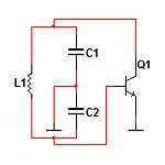 Hiernaast is een eenvoudig schema gegeven van een Colpitts-oscillator met gemeenschappelijke emitter. De collector belast een parallel afgestemde LC-kring die uit twee condensatoren (C1 en C2) en een spoel (L1) bestaat. Hierbij wordt een deel van het radiofrequente signaal opgevangen over condensator C2 en in de basis van de transistor (Q1) geïnjecteerd. Dit zal resulteren in het trillen van de LC-kring.