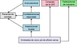 De bestuursstructuur van CNT is ontworpen om bureaucratie en concentratie van te veel macht in één orgaan tegen te gaan. De basis van de confederatie bestaat uit bonden die actief zijn binnen één economische sector of productielijn. Pas bij minder dan 25 personen kan een algemene bond op worden gericht, en bij minder dan vijf een 'confederale kern'. Binnen deze bonden worden de belangrijkste beslissingen genomen door middel van consensus en directe democratie. Zij kunnen besluiten tot het oprichten van een centraal comité dat de actie coördineert, maar dat in geen enkel geval beslissingsbevoegd kan zijn.