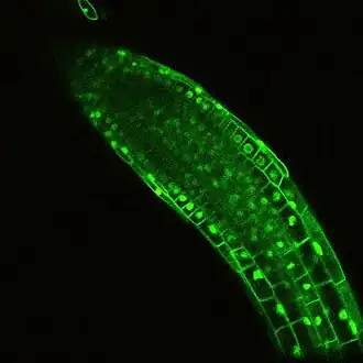 GFP is een eiwit afkomstig uit een kwal (Aequorea victoria). Door het DNA dat verantwoordelijk is voor de fluorescerende eigenschappen van GFP te koppelen aan het DNA van het onderzochte eiwit (genetische transformatie) en dit "fusie-eiwit" terug te plaatsen in de cel, kan met behulp van de CLSM celonderzoek worden verricht.
