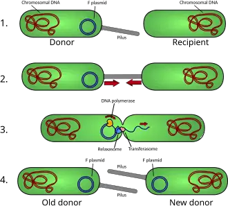 Bij het conjugatie-proces vormen twee bacteriecellen tijdelijk een verbinding via de pili, waardoor plasmiden van de ene naar de andere bacterie gaan. Conjugatie wordt ook wel 'bacteriële seks' genoemd, hoewel er geen echte seks is, omdat er geen samensmelting plaatsvindt van gameten die een zygote kunnen vormen.