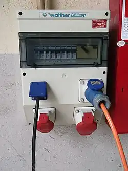 Onder twee rode voor 400 volt. Links 16 ampère, rechts 32 ampère.