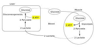 Bij actief werkende spieren is er niet genoeg zuurstof voor oxidatieve fosforylatie en wordt alle energie uit het anaerobe metabolisme gegenereerd.[1] Dit houdt in dat de glycolyse (afbraak van glucose tot pyruvaat) de enige bron is van ATP. De glycolyse zet hierbij NAD+ om in NADH, maar door de afwezigheid van oxidatieve fosforylatie wordt NADH onvoldoende terug geoxideerd. Het resultaat is dat de voorraad NAD+ opgeraakt en de cel niet meer aan glycolyse kan doen. Daarom zal de spier pyruvaat fermenteren tot lactaat (met lactaat dehydrogenase), deze reactie zet NADH om in NAD+. Lactaat wordt door de spier afgegeven aan de bloedbaan en door de lever opgenomen. De lever zet met hetzelfde enzym lactaat weer om in pyruvaat wat via de gluconeogenese wordt omgezet in vrij glucose. Vrij glucose kan terug naar de bloedbaan zodat het weer kan opgenomen worden door de spier waar de cyclus herbegint. Als de inspanning te lang duurt zal lactaat onvoldoende worden gemetaboliseerd. Dit resulteert in de gekende spier verzuring, omdat lactaat (wat een zuur karakter heeft) zich opstapelt in de spier. De dalende pH inhibeert dan de glycolyse om de spiercellen te beschermen.