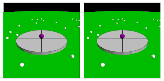 De bovenste animatie toont een bovenaanzicht van de draaiende plaat. De waarnemer (u, de lezer) bevindt zich in een stilstaand coördinatensysteem. De zwarte biljartbal rolt, vanuit u gezien, in een rechte lijn over de plaat. De zwarte bal beschrijft de baan die verwacht wordt, namelijk als een eenparige, rechtlijnige beweging. De plaat draait als het ware onder de biljartbal door. Hierbij wordt aangenomen dat de rollende biljartbal zich verplaatst als een object dat zonder wrijving over de plaat glijdt.