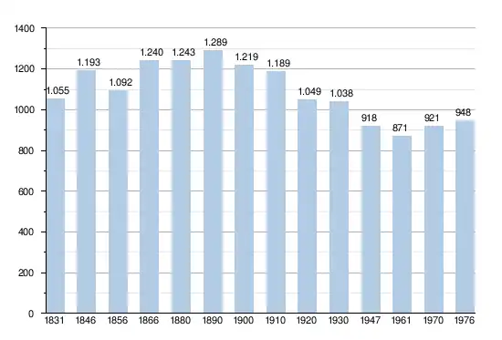 - Bronnen:NIS, Opm:1831 tot en met 1970=volkstellingen, 1976= inwonersaantal op 31 december