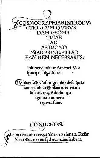 De volledige titel van het boek luidt: "Cosmographiae introductio cum quibusdam geometriae ac astronomiae principiis ad eam rem necessariis. Insuper quatuor Americi Vespucii navigationes. Universalis Cosmographiae descriptio tam in solido quam plano, eis etiam insertis, quae Ptholomaeo ignota a nuperis reperta sunt."