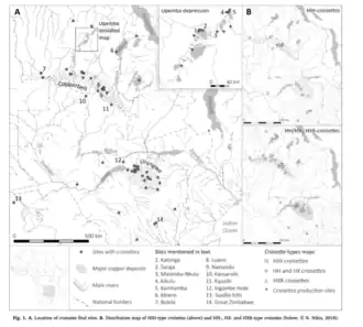 - ↑ a b c d e f (en) Rademakers, Frederik W., Nikis, Nicolas, De Putter, Thierry, Degryse, Patrick (1 november 2019). Provenancing Central African copper croisettes: A first chemical and lead isotope characterisation of currencies in Central and Southern Africa. Journal of Archaeological Science 111: 105010. ISSN:0305-4403. DOI:10.1016/j.jas.2019.105010.