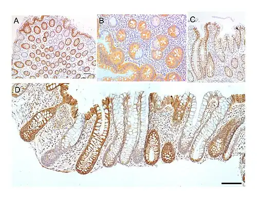 In deze afbeeldingen zijn de cellen gekleurd om een bruinoranje kleur te tonen als de cellen een mitochondriaal eiwit produceren dat cytochroom c oxidase subunit I (CCOI of COX-1) wordt genoemd. De celkernen (gelegen aan de buitenste randen van de cellen die de wanden van de crypten bekleden) zijn blauwgrijs gekleurd met hematoxyline. Zoals te zien is in C en D, zijn de crypten ongeveer 75 tot ongeveer 110 cellen lang. De gemiddelde omtrek van de crypten is 23 cellen.[8] Uit de afbeeldingen blijkt dat het gemiddelde ongeveer 1.725 tot 2530 cellen per colonische crypt is. Een andere maat werd bereikt, wat een bereik van 1500 tot 4900 cellen per colonische crypt opleverde.[9] Cellen worden geproduceerd aan de basis van de crypt en migreren omhoog langs de crypt-as, voordat ze dagen later in het lumen van de kronkeldarm terechtkomen.[8] Er bevinden zich 5 tot 6 stamcellen aan de basis van de crypten.[8] Uitgaande van afbeelding A, zijn er ongeveer 100 coloncrypten per vierkante millimeter van het colonepitheel.[10] De lengte van de menselijke kronkeldarm (colon) is gemiddeld 160,5 cm (gemeten vanaf de onderkant van de blindedarm tot de colorectale verbinding) met een bereik van 80 cm tot 313 cm.[11] De gemiddelde binnenomtrek van de kronkeldarm is 6,2 cm.[11] The average inner circumference of the colon is 6.2 cm.[10] Het binnenoppervlak van het epitheel van de menselijke kronkeldarm heeft dus gemiddeld een oppervlakte van ongeveer 995 cm², wat 9.950.000 (bijna 10 miljoen) crypten omvat.