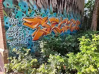 Nadat Suso33 klaar was met de “tekening” kwam Juice terug om zijn tag te “renoveren”, het werd een zogenaamde “throw-up”. De throw-up is geplaatst op blauwe dobbelstenen die de handtekening van Juice benadrukken.